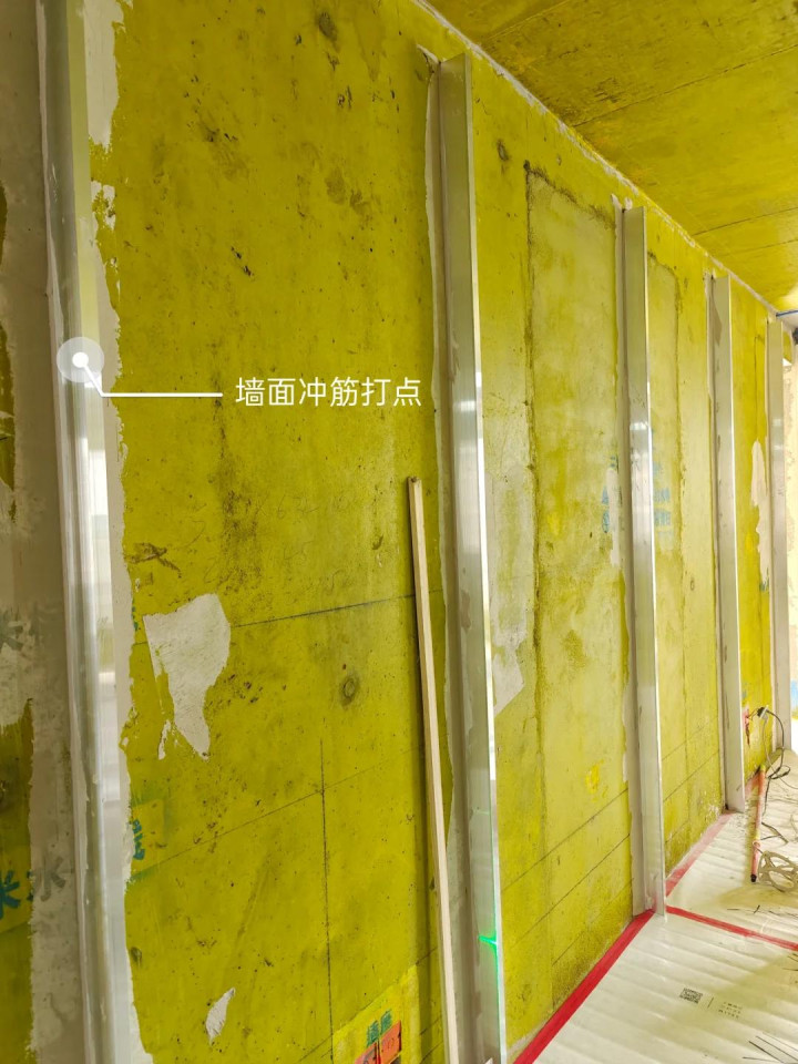 定点冲筋,很多人不明白是什么意思,其实就是通过大面积的石膏找平,让墙面达到更平整的一种工艺,一般比常规的顺平工艺要贵上不少。