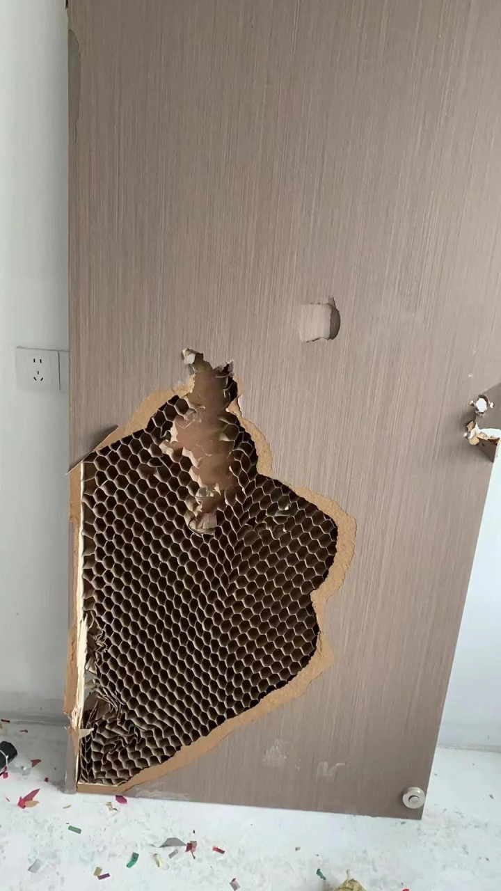 实木复合木门的套路,主要在填充材料上,大部分商家都只会说自己卖的是实木门,他们不会告诉你,只有边框是实木的,里面的填充全是劣质废料,比如纸壳、碎木屑,甚至还有用 “小当家”的零食包装袋压的废料填充,这种门卖给你至少1000块,不仅隔音效果差,而且用几年就会受潮鼓包。