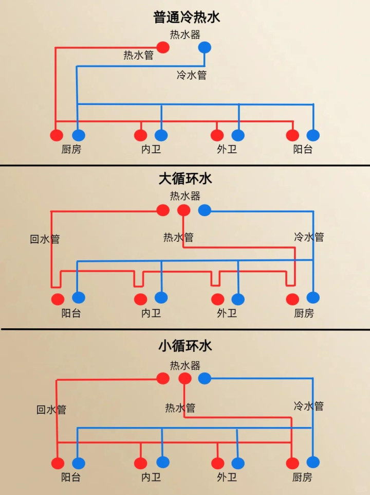 零冷水系统分为两种,一种是大循环,一种是小循环。装修公司一般只会给你推荐小循环,他们会告诉你,小循环更便宜,效果都一样。